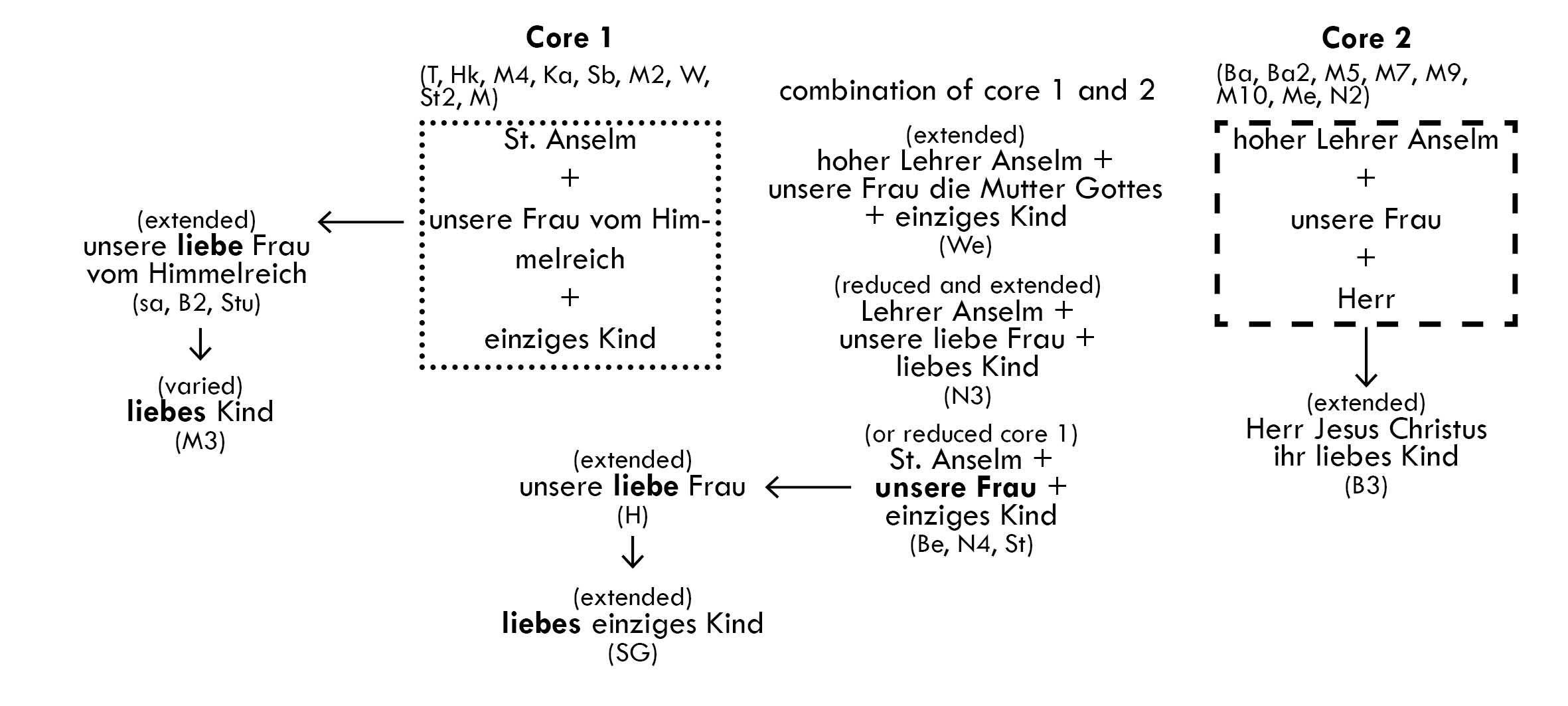 The project Questions by St. Anselm about the Lord’s Passion, funded by DFG, deals with a popular medieval dialogue between Anselm of Canterbury and Saint Mary. The text has been preserved in various German dialects in more than 60 manuscripts and prints from the 14th–16th centuries, all of which have been transcribed and are currently being annotated. The ultimate goal of the project is to use the corpus for various cross-linguistic investigations, such as comparing spelling or word-order variation between different dialects. Sample data is already available and can be searched via ANNIS.