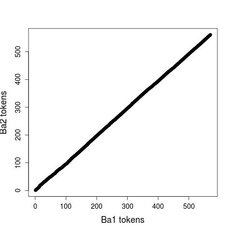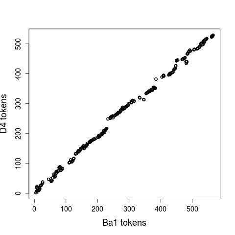 For evaluating our guidelines, two annotators independently aligned the first 500 words of two Anselm text pairs: one with to similar Anselm versions (Ba1 and Ba2), the other with two dissimilar Anselm versions (Ba1 and D4). Figure 1, displaying the links between Ba1 and Ba2, indicates that the correlation between both fragments is almost perfect (aligning a text with itself would result in a diagonal). The plot of the dissimilar texts (Fig. 2), Ba1 and D4, still clearly approximates the diagonal, which mirrors the fact that both fragments have the same topic. At the same time, it shows considerable deviations and alignment gaps. For the alignment task, the annotators used the annotation tool MMAX2, which allows to display two text adjacently to each other. As a measure of the inter-annotator agreement, we used Word Alignment Agreement (WAA) and the chance-corrected kappa score. If we merge all four layers in one, the annotator agreement on the alignment as such is very high, while the decision about the type of alignment (i.e. its layer) is more controversial. Here, the best results are attained for the cognate and synonym layer while annotating the co-reference and CPE layer seems to be a considerably difficult task.